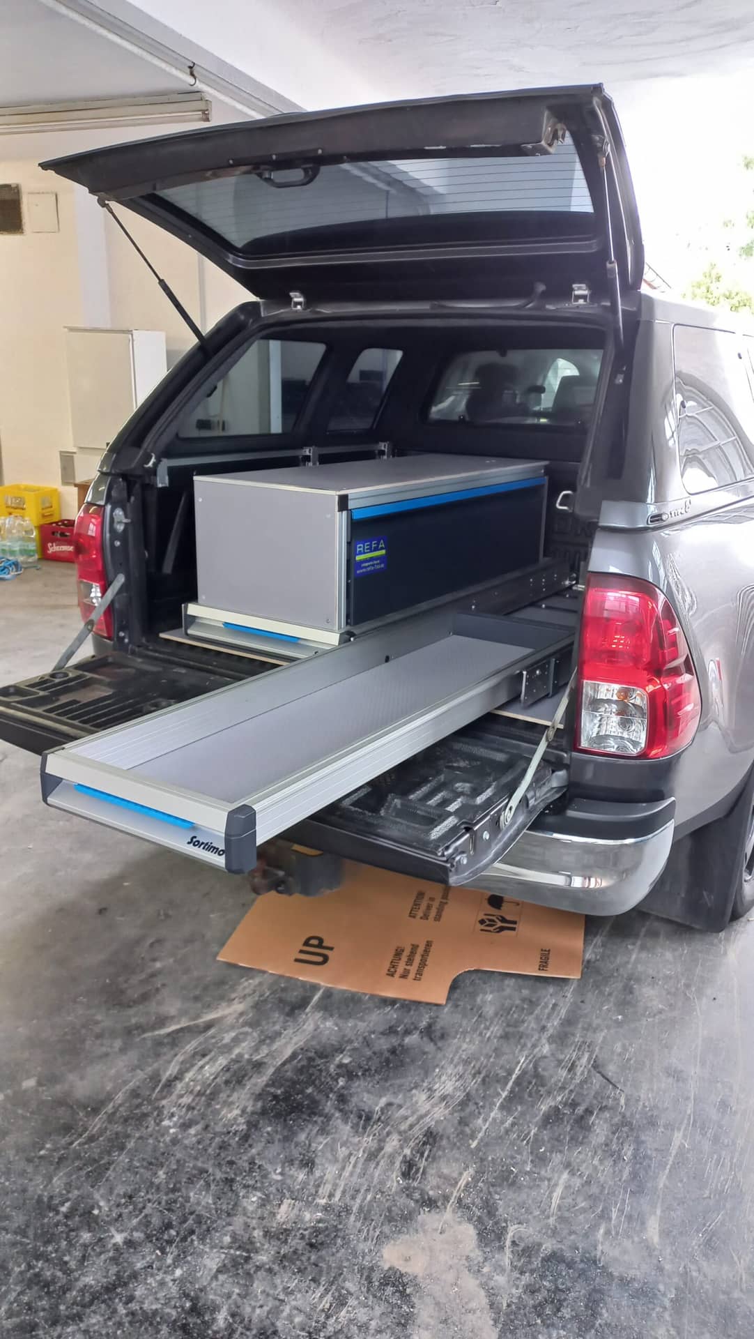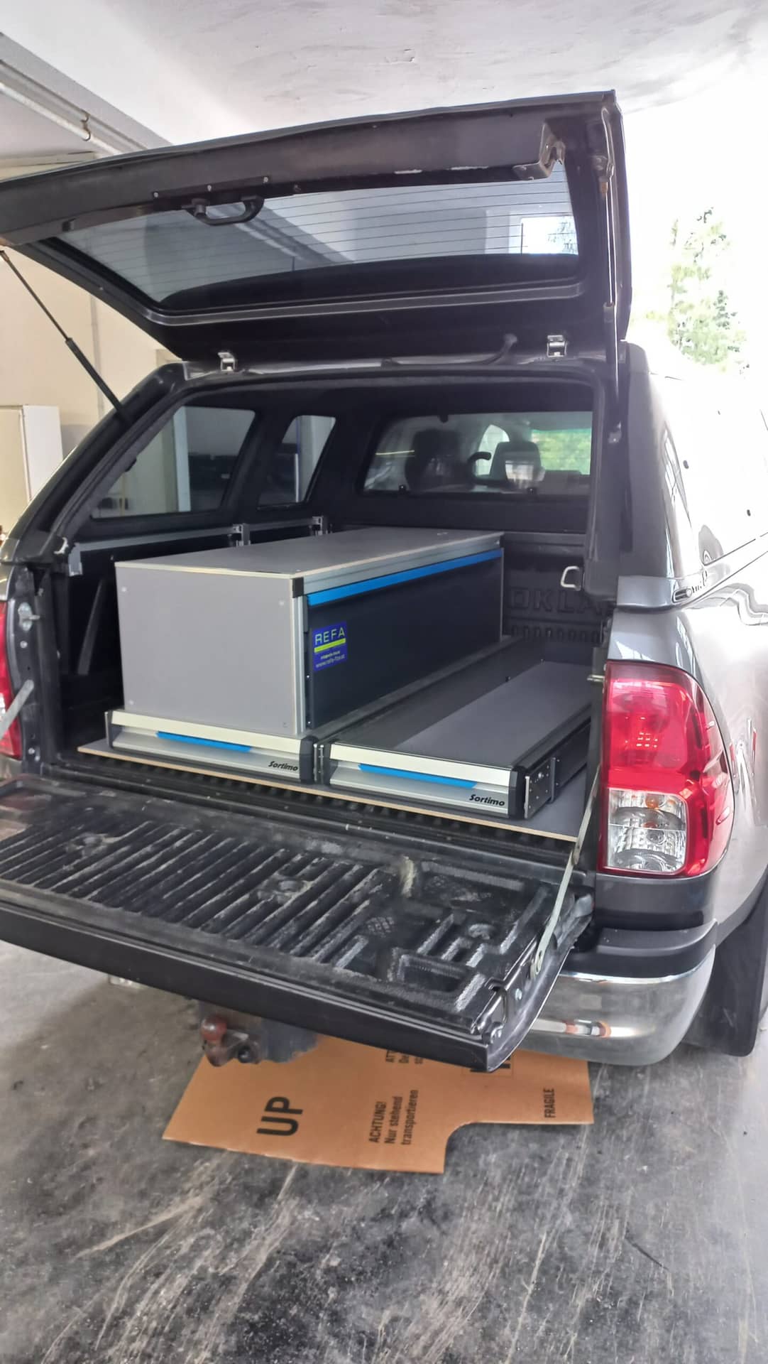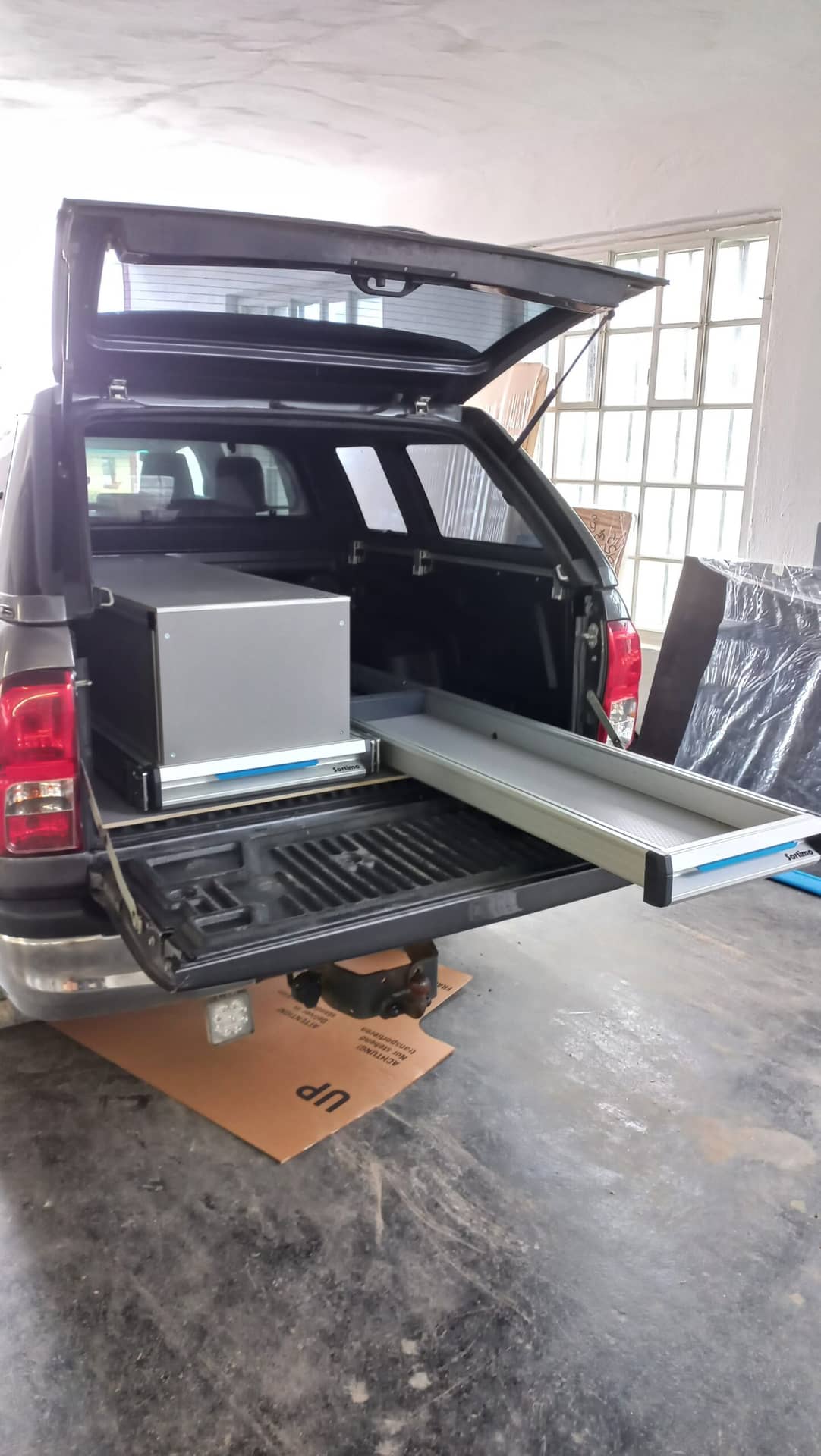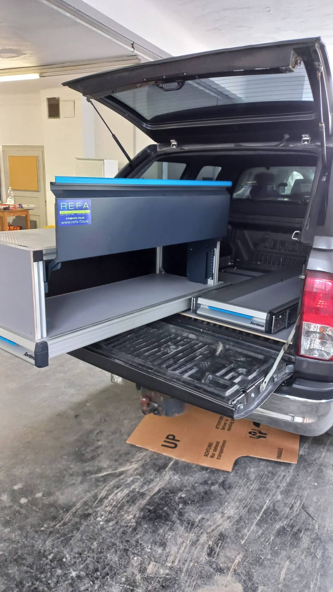 Die gesamte Bodenplatte wurde am Fahrzeugboden so verschraubt, dass mittels weniger Handgriffe in kürzester Zeit die Ladefläche des PickUps wieder komplett frei wird. Dies ermöglicht auch den Transport größerer Waren.