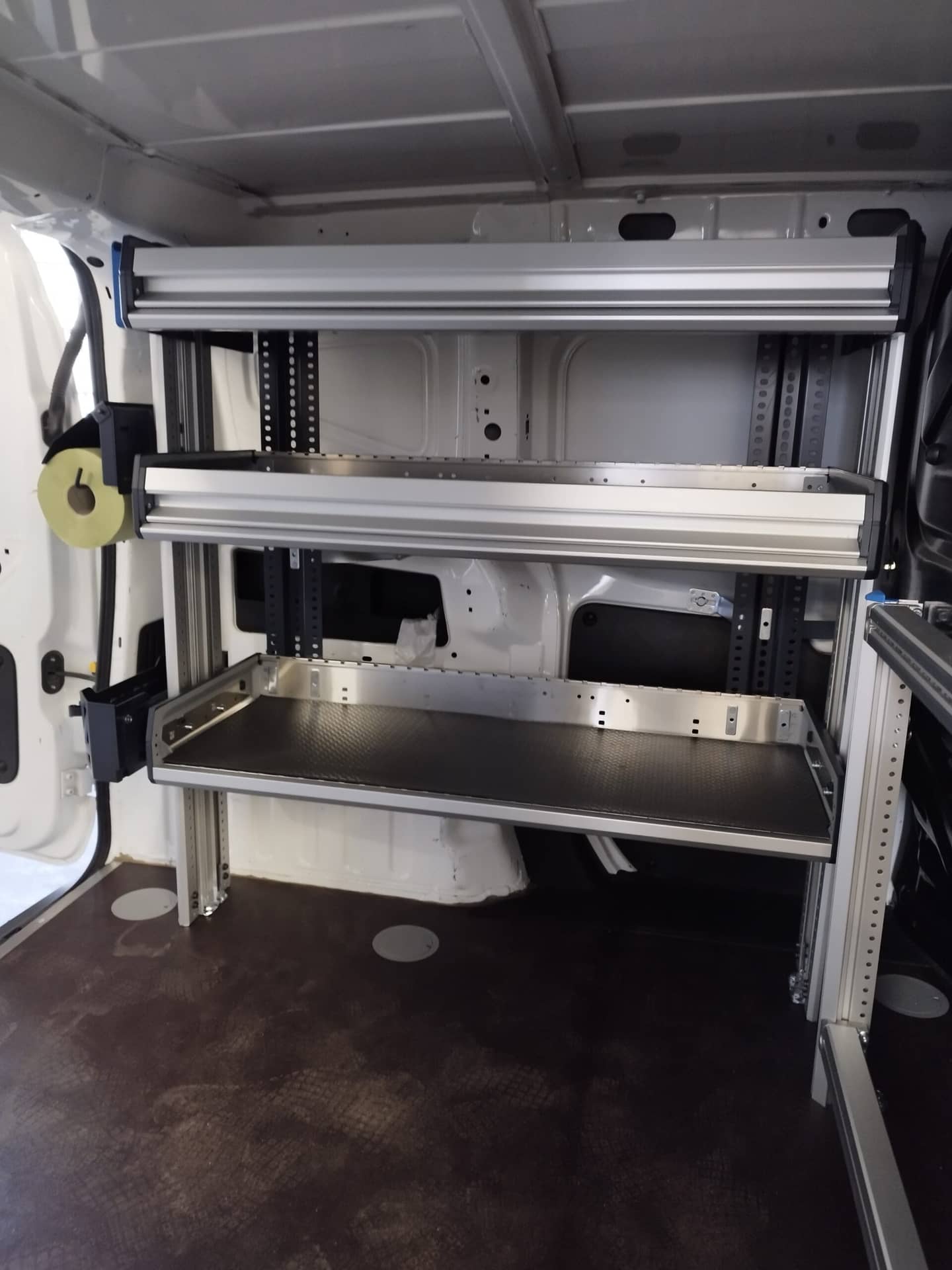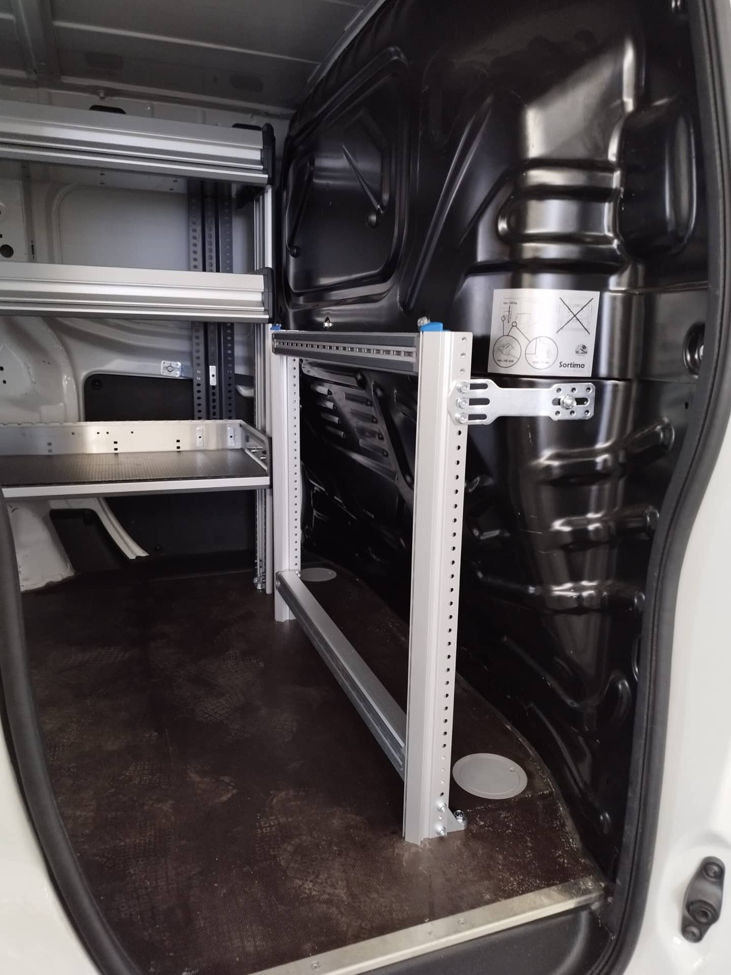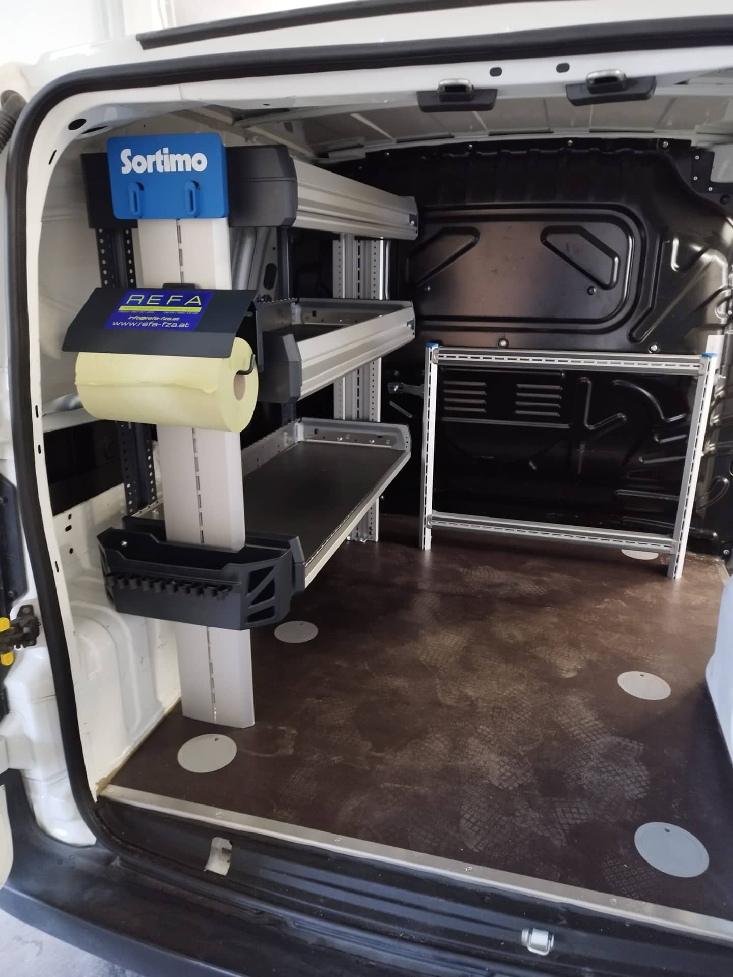 Auf der linken Seite wurde ein Sortimo SR5 Regal mit Fachböden verbaut, das für übersichtliche und sichere Aufbewahrung von Material und Werkzeug sorgt. Die bereits vorhanden Boxen passen nun perfekt in die Fachböden.