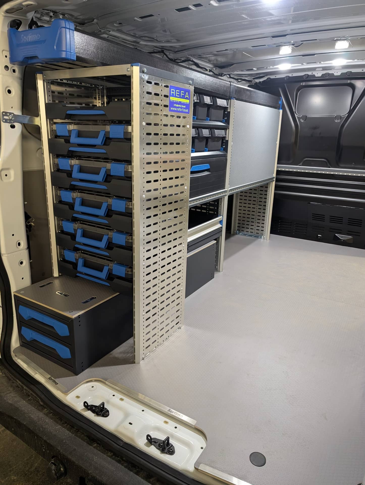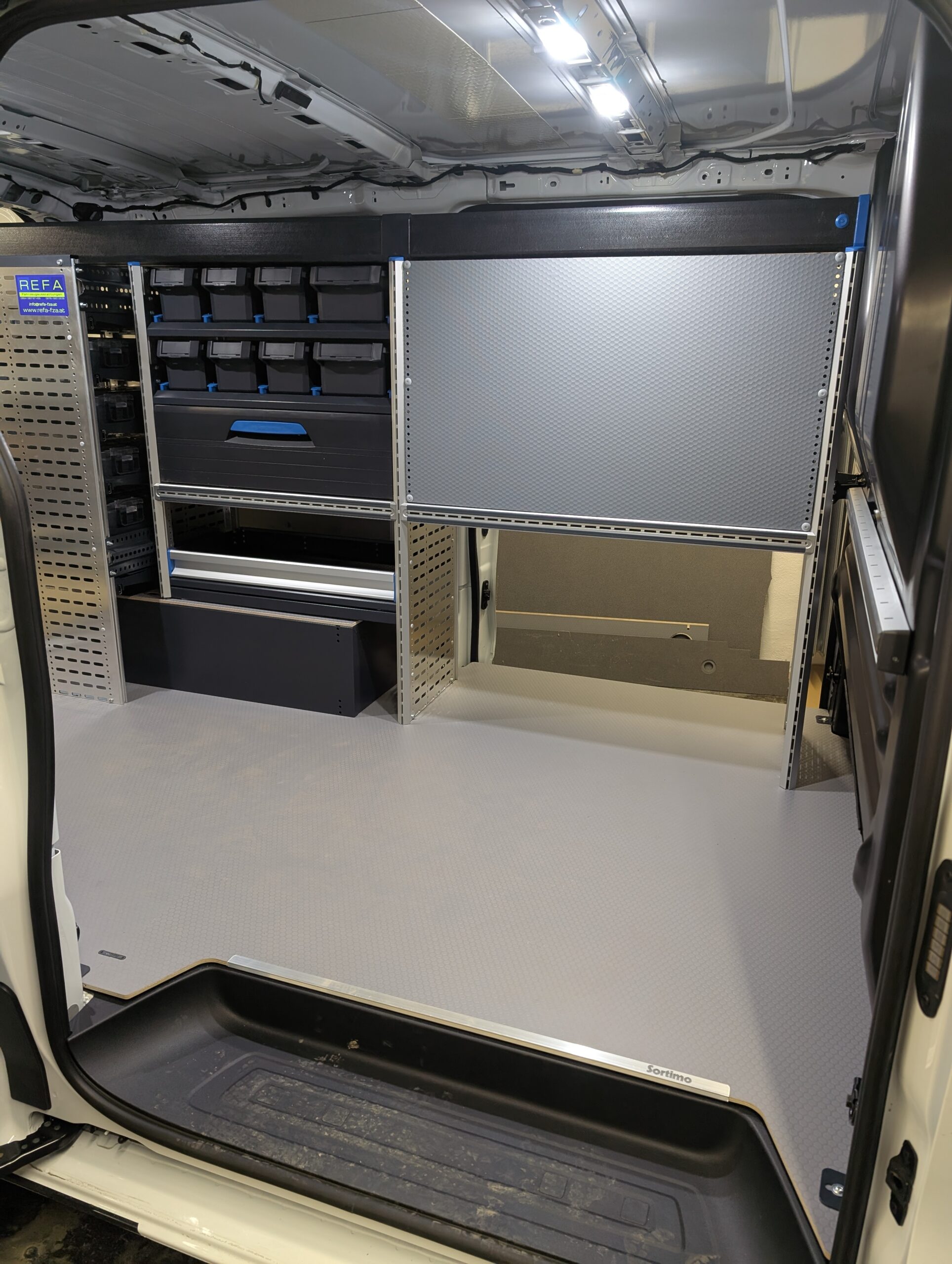 Die Anordnung der Regale ermöglicht es, dass alle oft benötigten Werkzeuge und Kleinteile vom Regal entnommen werden können, ohne dass das Fahrzeug betreten werden muss. Von der linken Schiebetüre erreicht man die Werkzeugkoffer, 5 Schubladen, sowie einen Fachboden mit Klappe für sonstiges Verbrauchsmaterial.