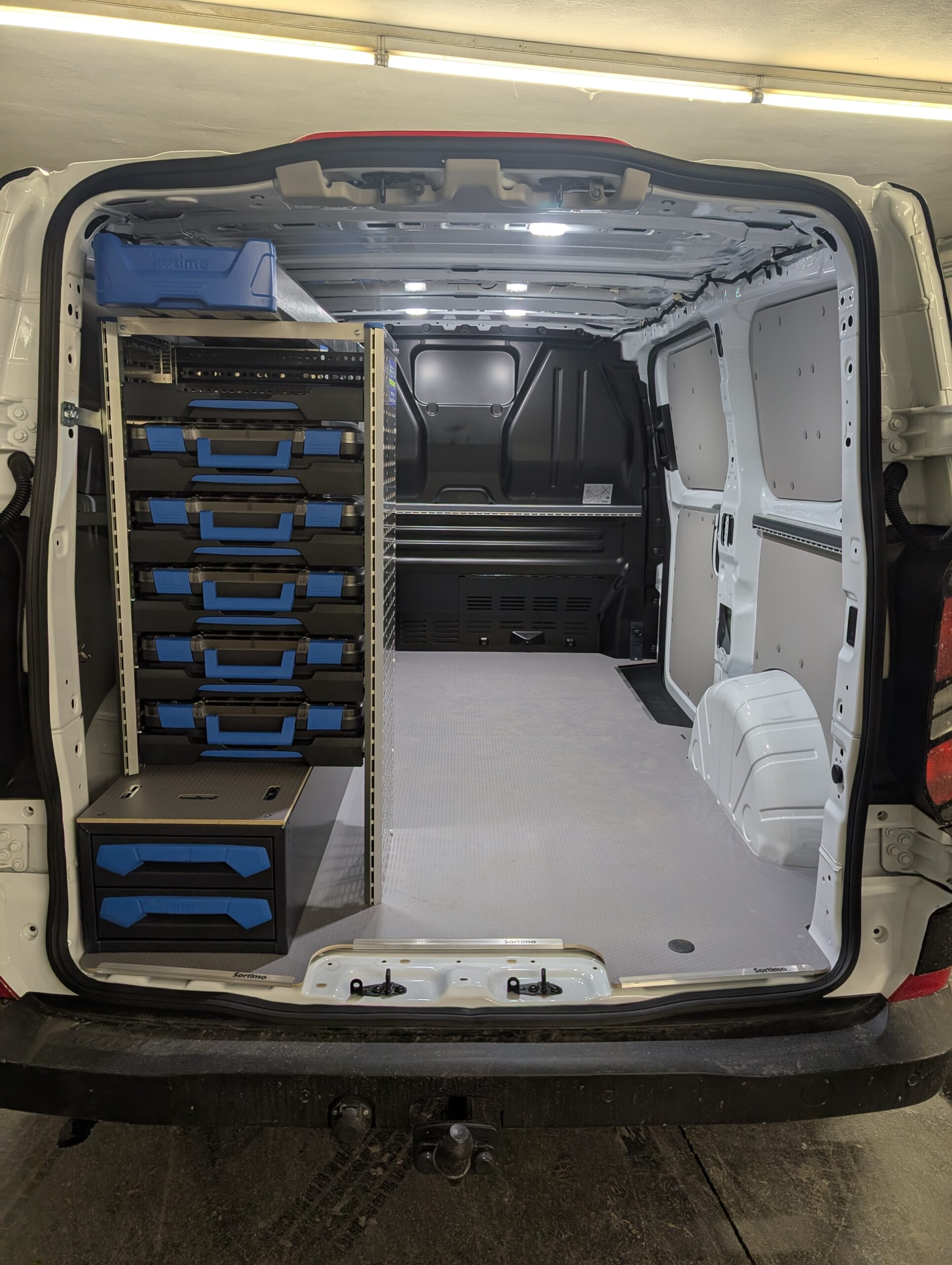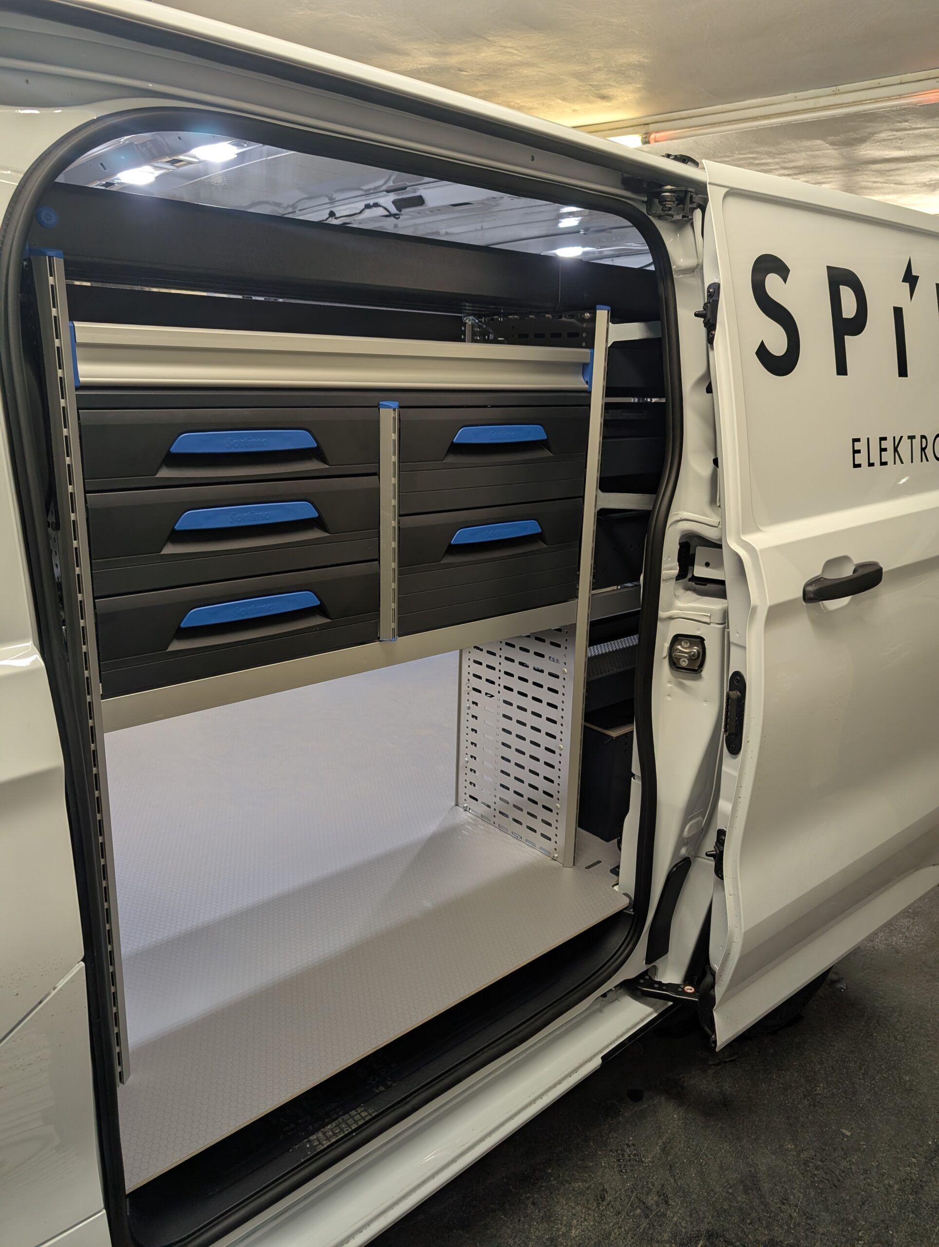 Der Ford Transit Custom der Firma Spiegl – Elektro + Klima wurde mit einem praktischen zweiteiligen Sortimo-Regal inkl. Jumbo-Unit ausgestattet.